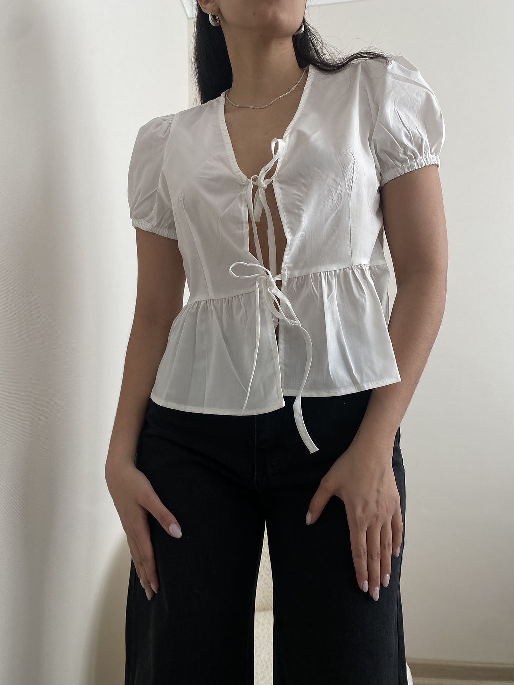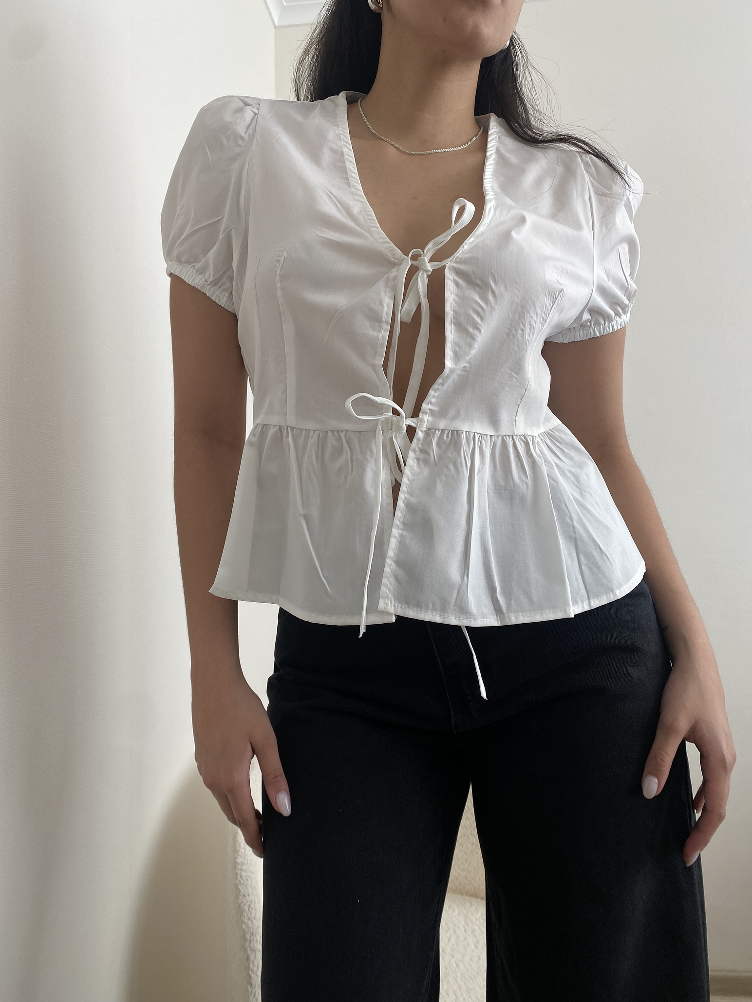 Nuestra linda blusa, con sus lazos delanteros y mangas estilo globo, ideal para este verano y tus looks de ensueño